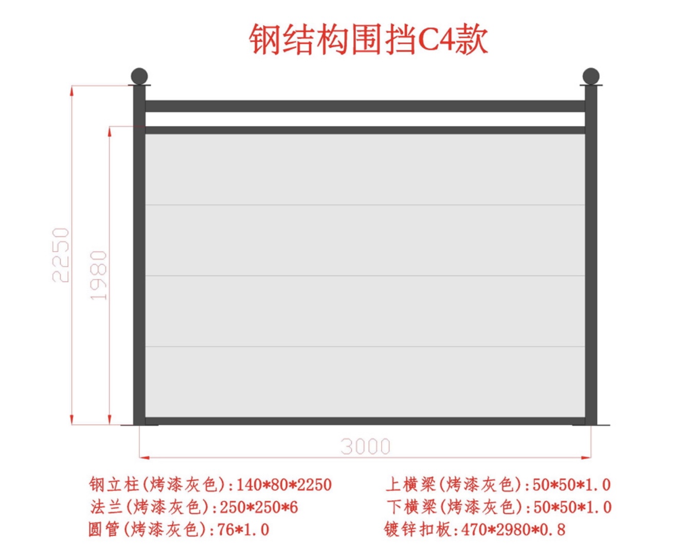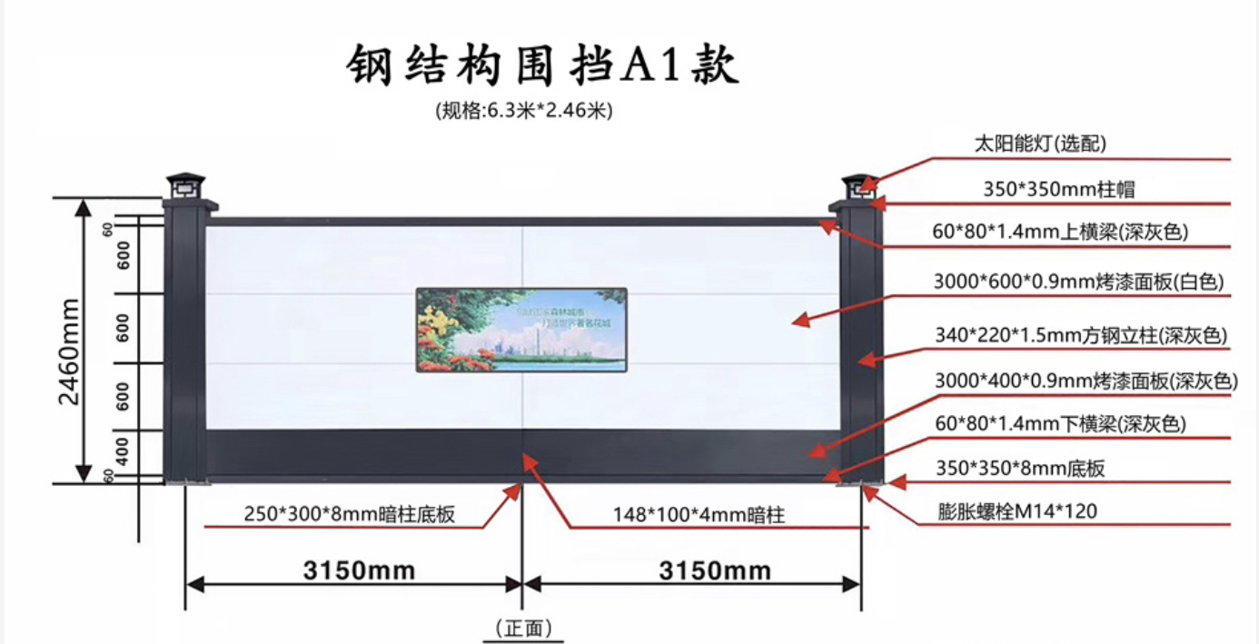 而鋼結(jié)構(gòu)圍擋C款是在深圳市交委方案標(biāo)準(zhǔn)設(shè)計(jì)的基礎(chǔ)上,稍做優(yōu)化,上下橫梁為50*50方通,圓梁改為76鋼管,面板為鍍鋅扣板2980*470,灰色烤漆立柱高度為2.25米,加上預(yù)制基礎(chǔ)高度30cm,達(dá)到交委要求圍擋的整體高度、地面以上2.5m ,使人行道、廣場(chǎng)、泥巴地這些不易安裝的地方更好施工,并且為客戶節(jié)約了一定的材料費(fèi)用。